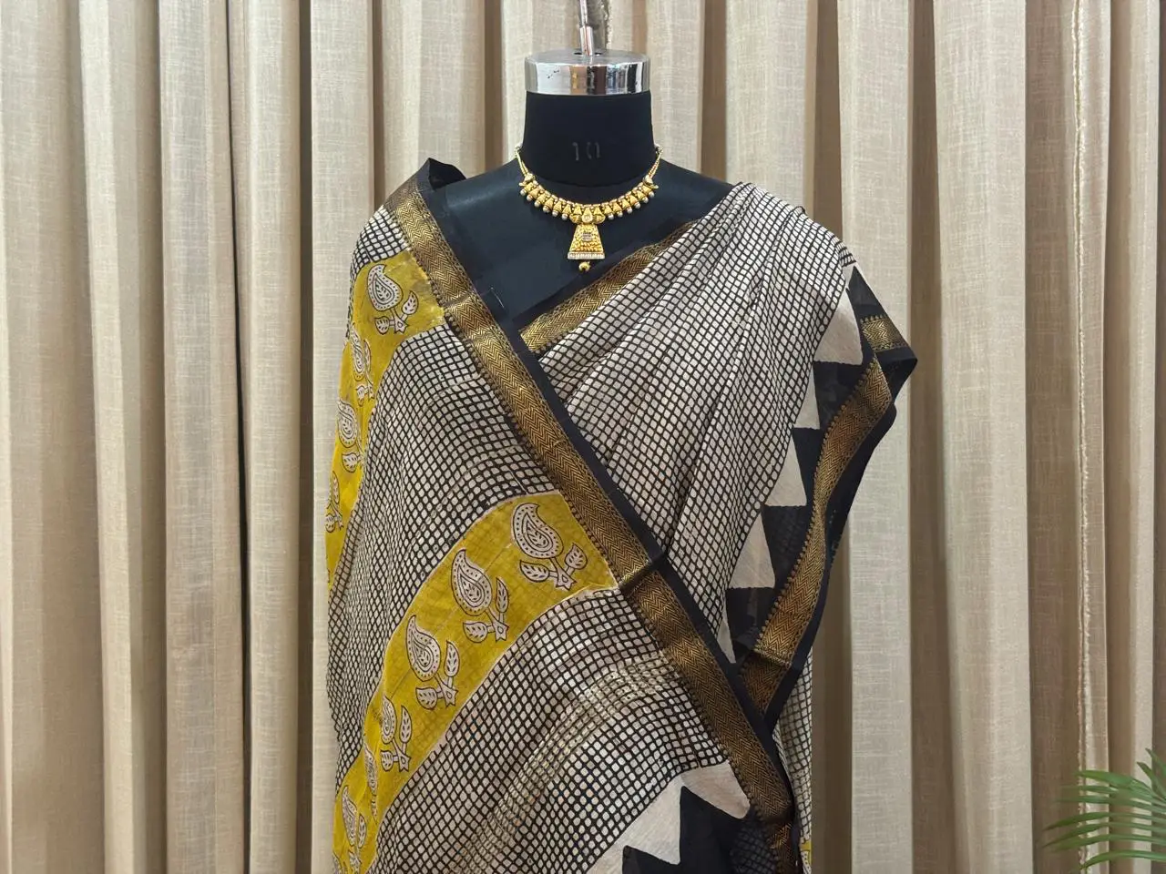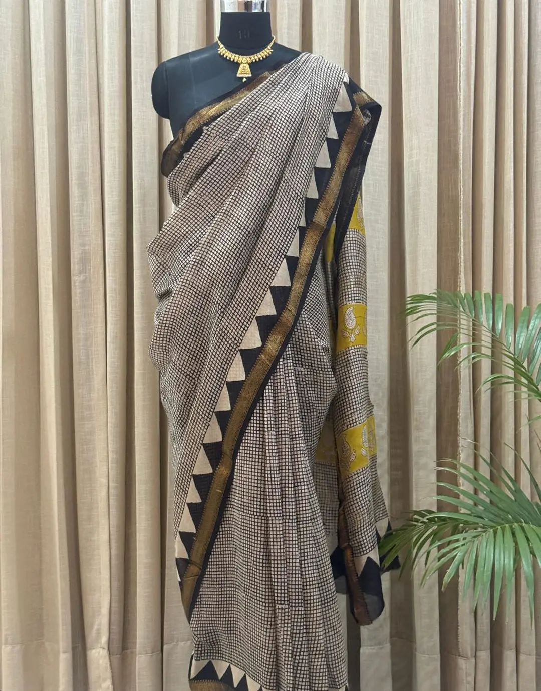 - Hand Block Printed Maheshwari Saree in Black & Mustard
