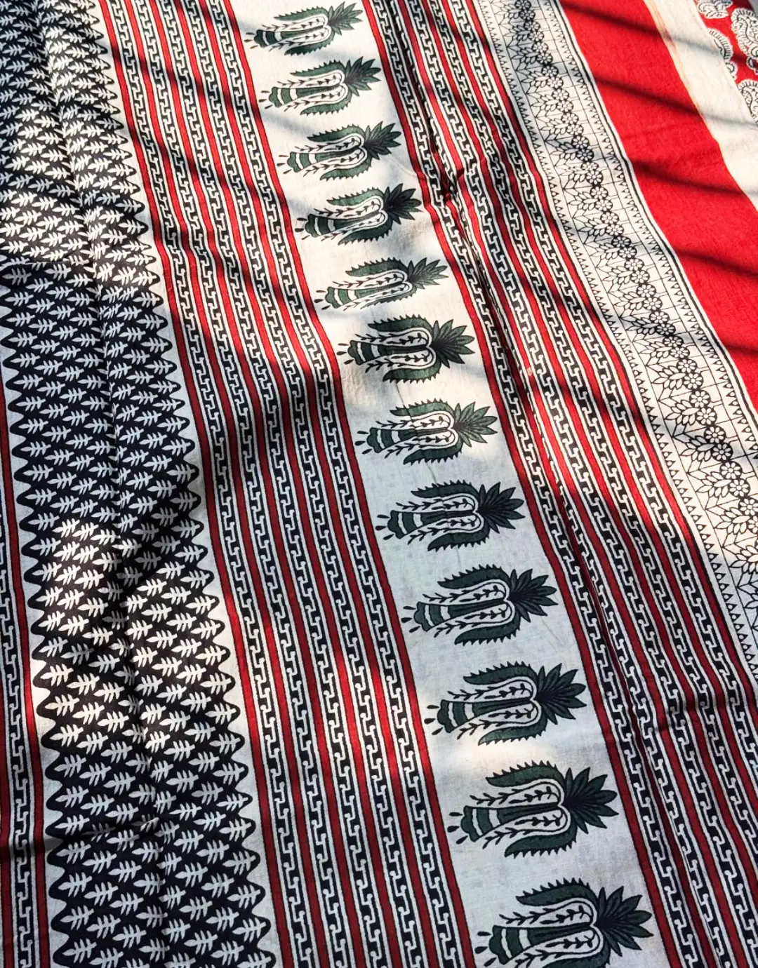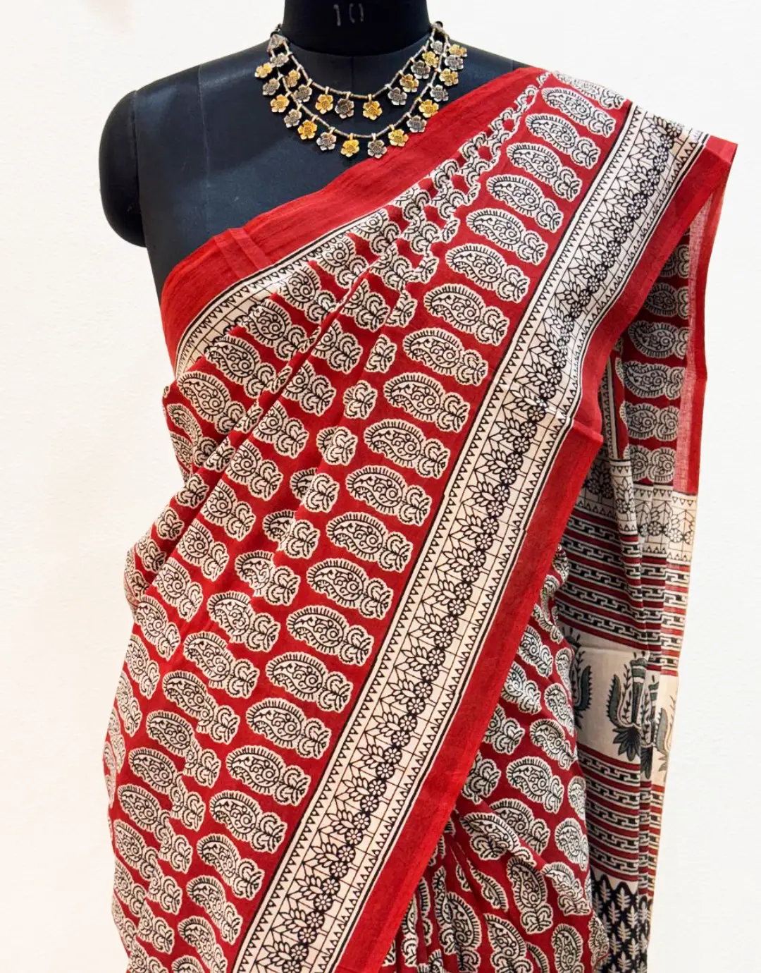 The saree features a rich deep red base, beautifully adorned with traditional paisley block prints in black and beige tones. The border showcases intricate folk and geometric block patterns, giving the saree a hand-crafted, heritage appeal. The pallu continues the artistic story with detailed tribal-style motifs, adding depth and elegance.