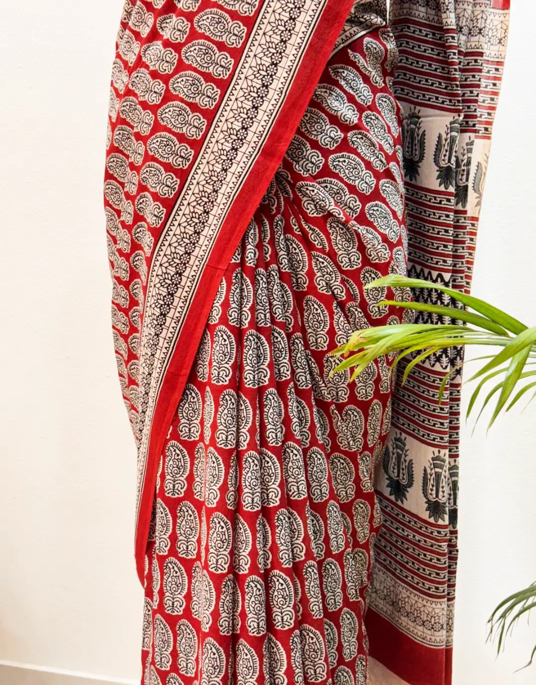 Pure Mul Cotton Hand Block Printed Saree in Red with Traditional Paisley & Tribal Border – Shriyyum Exclusive
