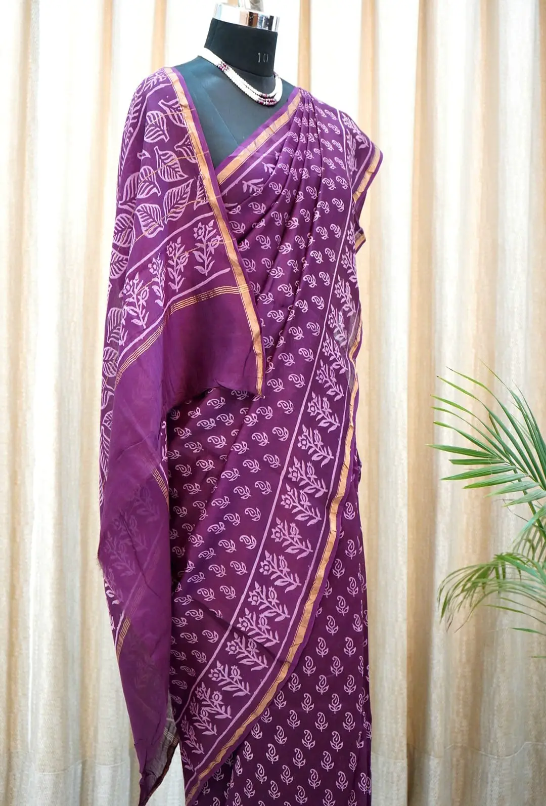 Crafted from pure Chanderi silk, this saree beautifully merges traditional weaving with contemporary aesthetics. The body is adorned with intricately hand block printed floral and leaf motifs, while the golden zari border adds a regal finish. Its rich purple hue symbolizes sophistication and grace, making it perfect for festivals, weddings, and formal occasions.