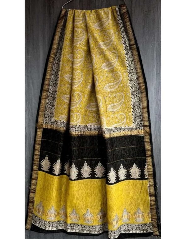 - Hand Block Printed Maheshwari Saree in Black & Mustard