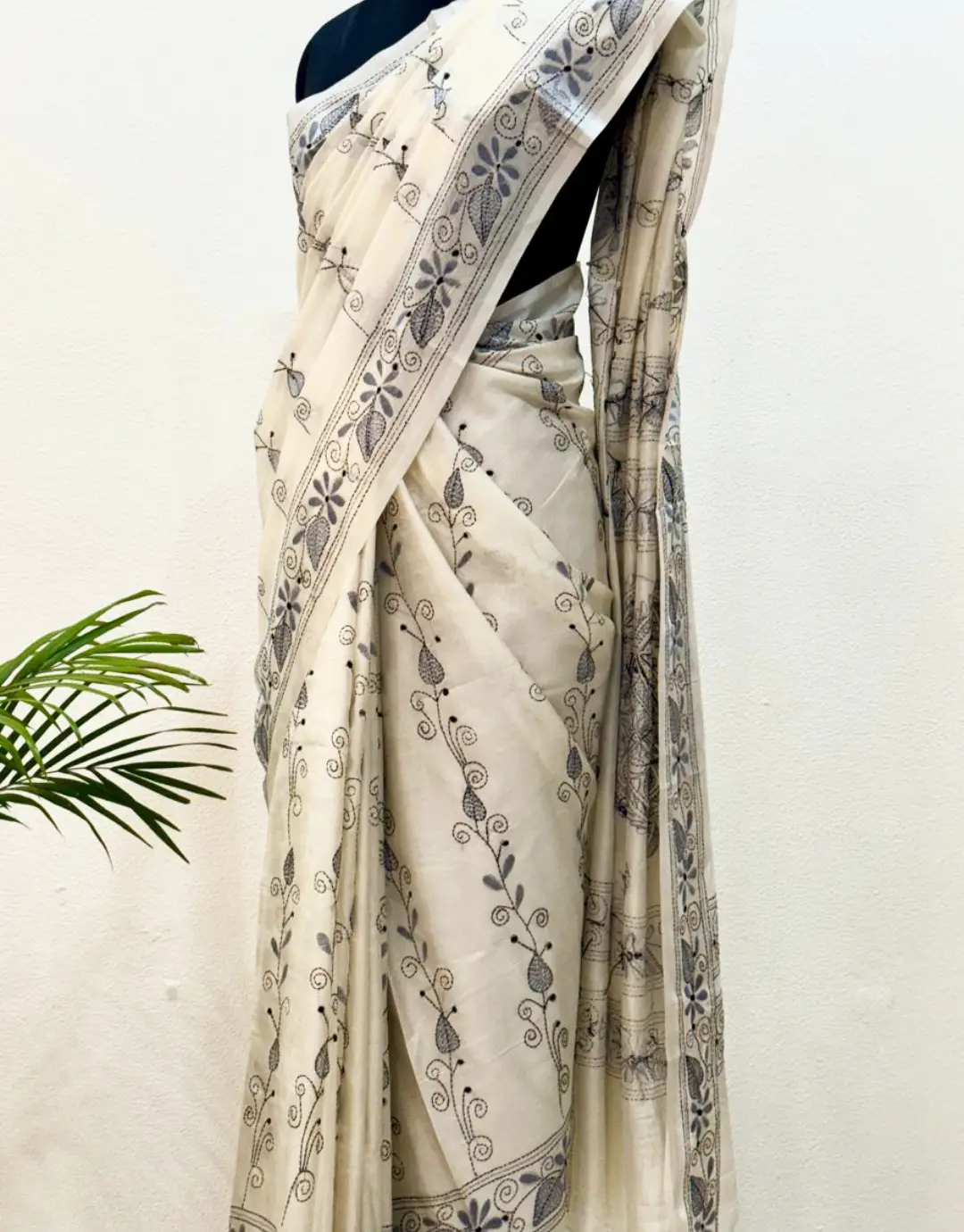 White Kantha Stitched Hand Embroidery Saree in Bangalore Silk | Shriyyum Sarees
