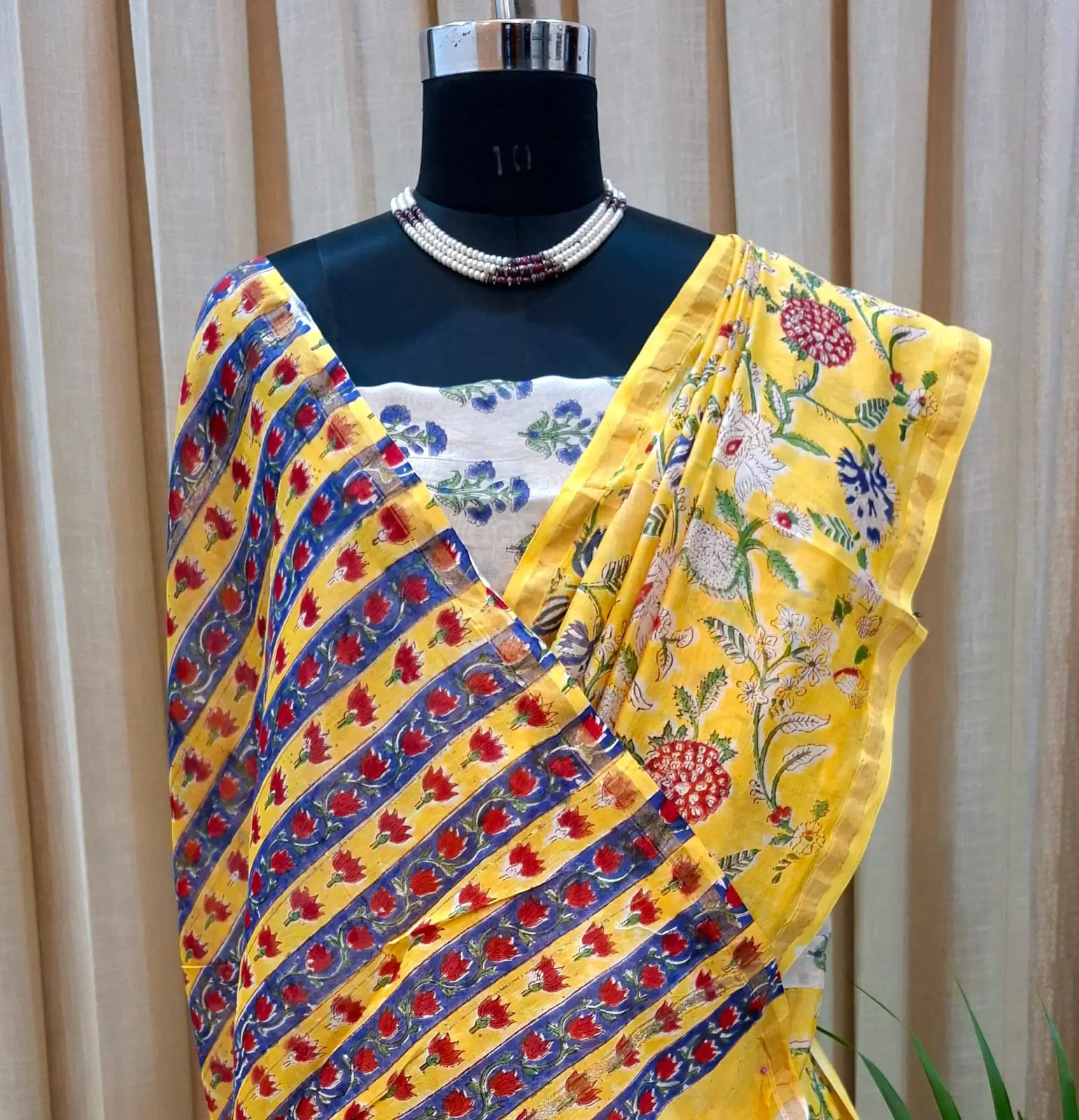 💛 Grace meets tradition in this Yellow Chanderi Silk Saree adorned with elegant handblock floral prints. Known for its lightweight texture, sheer elegance, and royal appeal, Chanderi silk is the ultimate choice for festive occasions, weddings, Durga Puja, Navratri, and Diwali celebrations. 🌸✨